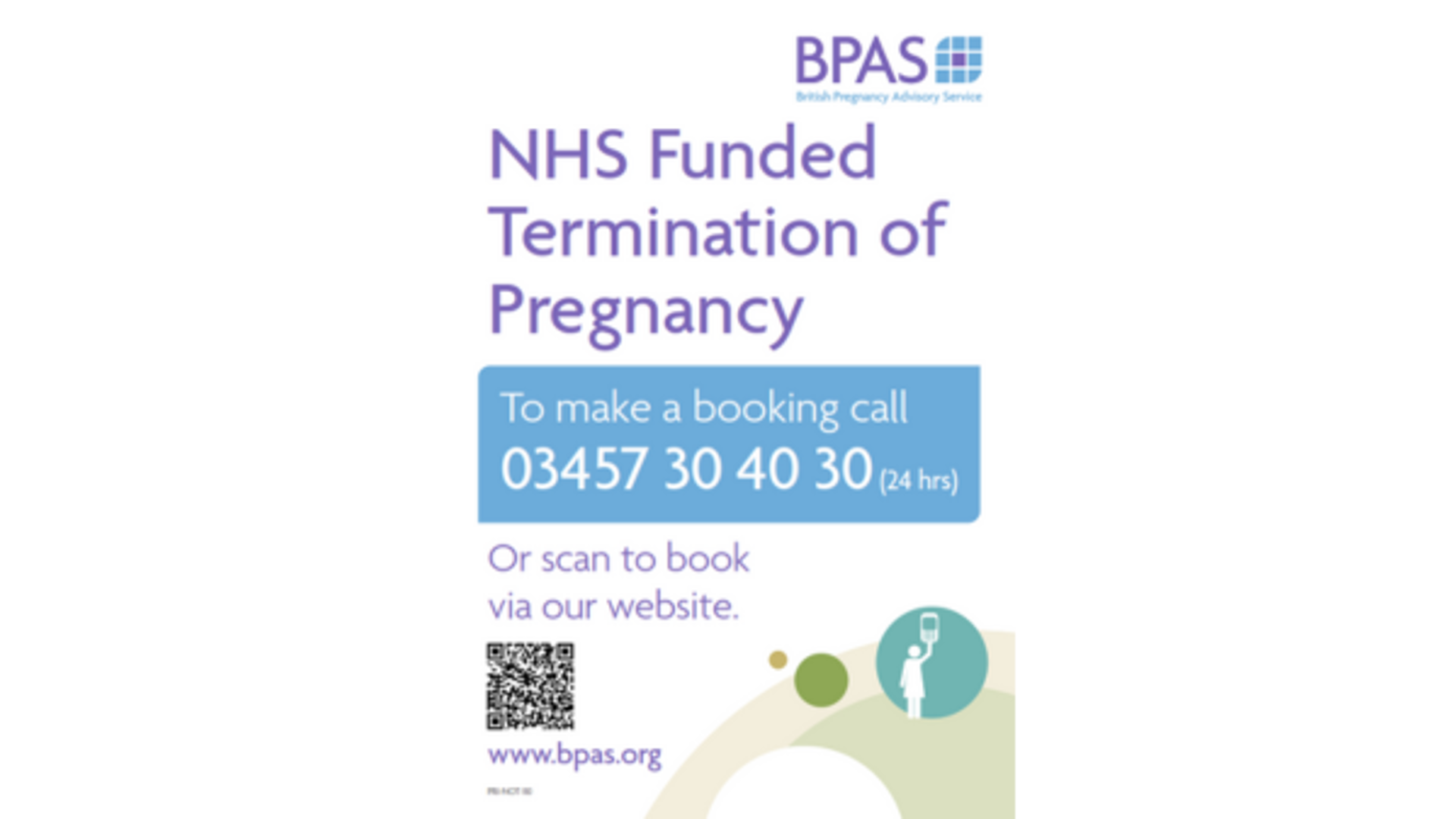 Poster for pharmacies to display in their safe spaces reserved for domestic abuse victims. 1 in 5 women having abortions are victims of domestic abuse. Pills by Post is a safe and legal service to end a pregnancy at an early gestation without needing to attend a clinic for treatment. The poster encourages women to call for an appointment. Please note the telephone number featured is the main 03457 30 40 30 BPAS Booking and Information telephone number, therefore it does not apply if a Central Booking Service (CBS) is in operation and an alternative telephone number is used.